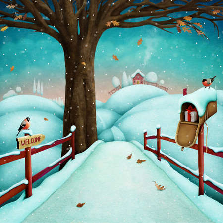 冬のホリデーのグリーティングカードまたは村の冬の雪の風景とイラストやポスター の写真素材 画像素材 Image